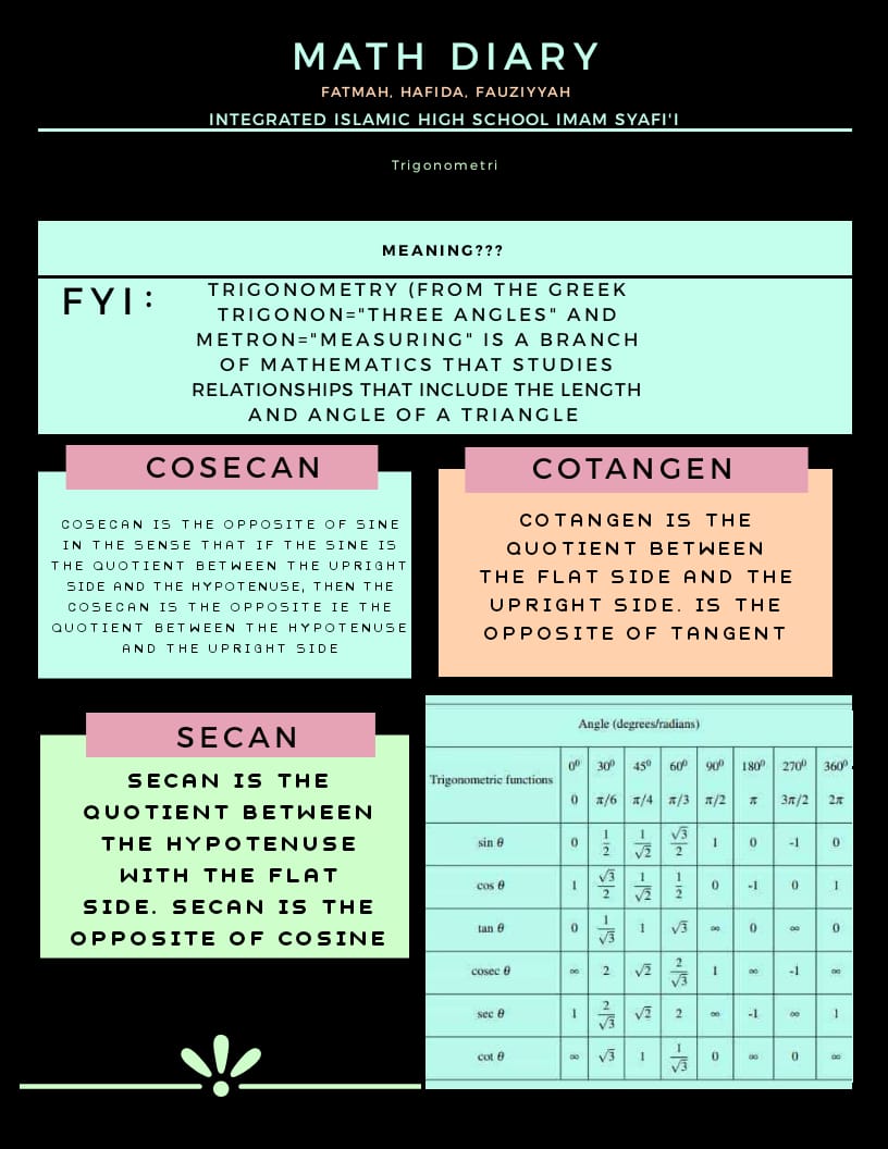 Salah satunya adalah produk Math Diary berupa informasi seputar materi pembelajaran matematika yang didesain sedemikan rupa dalam bentuk elekronik flayer (selebaran elektronik) satu halaman, oleh santriwati kelas X Aisyah dalam mata pelajaran matematika.