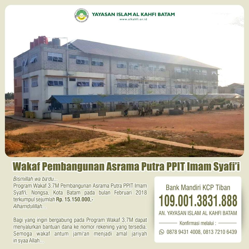 Read MoreWakaf Pembangunan Asrama Putra PPIT Imam Syafi’i Bismillah wa ba’du Program Wakaf 3,7M Pembangunan Asrama Putra PPIT Imam Syafi’i Nongsa, Kota Batam pada bulan Februari 2018 terkumpul sejumlah Rp. 15.150.000,- Alhamdulillah… Bagi yang ingin bergabung pada Program Wakaf 3,7M dapat menyalurkan bantuan dana ke nomor rekening yang tersedia. Semoga wakaf antum jami’an menjadi amal jariyah…