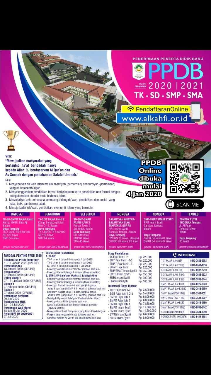 Read MoreBatam, 26 Desember 2019 Alhamdulillah segala puji hanya milik Allah ‘Azza wa jalla. Shalawat dan salam semoga senantiasa tercurahkan kepada Nabi Muhammad shallahu ‘alaihi wasallam. Amma ba’du. Dalam rangka meningkatkan pelayanan kepada kaum muslimin yang ingin mendaftrakan anakya di unit PPIT Imam Syafi’i yang berada di bawah Yayasan Islam Al Kahfi, maka untuk Penerimaan Peserta…